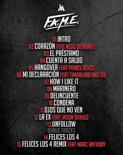 F.A.M.E. significa: Fe, Alma, Música y Esencia. Corresponde al tercer álbum de estudio del artista, luego del exitoso álbum Pretty Boy Dirty Boy lanzado en 2015. El nuevo trabajo discográfico de quince canciones cuenta con varias colaboraciones: Timbaland, Marc Anthony, Prince Royce, SID y Nego Do Borel y fue producido por Rude Boyz, Edgar Barrera, Timbaland y Scott Storch, entre otros. F.A.M.E. son las siglas que describen el álbum y contiene cuatro de sus hits que ya se han convertido en éxitos mundiales.