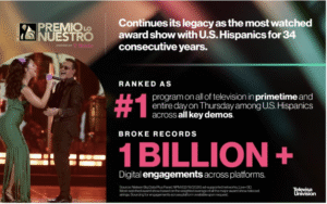 Además, Premio Lo Nuestro continuó su legado como la entrega de premios más vista en toda la televisión entre los Adultos Hispanos de EE. UU. 18-49durante los últimos 34 años consecutivos, ocupando cuatro de las cinco transmisiones de premios más vistas de todos los tiempos en dicho grupo demográfico. Sigue siendo el líder indiscutible de las entregas de premios en español desde que comenzaron las mediciones de Nielsen en 1992, habiéndose clasificado como el programa de premios musicales No. 1 o No. 2 cada año durante tres décadas, y asegurando la posición del programa de televisión con mayor audiencia entre los Adultos Hispanos de EE. UU. 18-49 en su fecha de emisión por 32 años consecutivos.