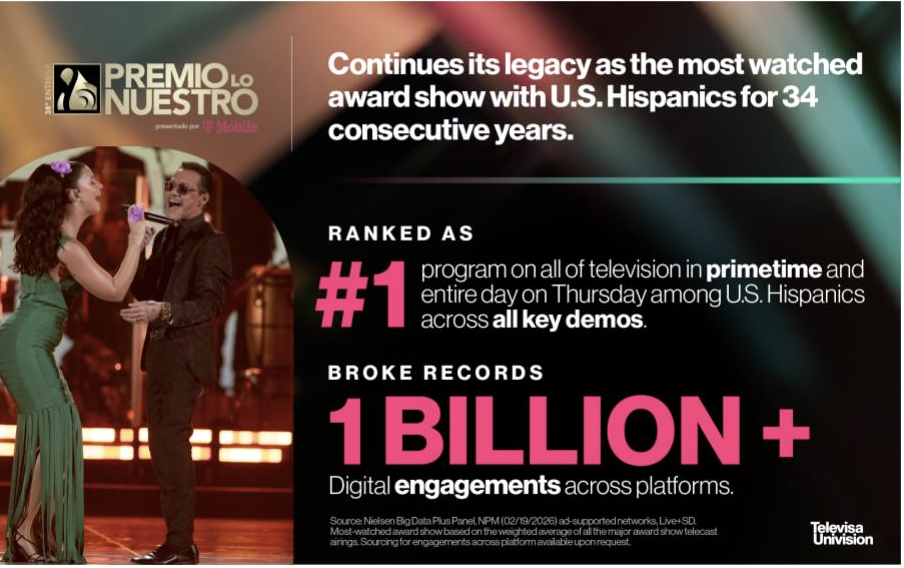 La 38ª transmisión anual de Premio Lo Nuestrode TelevisaUnivision, que se emitió el jueves 19 de febrero desde el Kaseya Center en Miami, dominó con más de mil millones de interacciones en televisión, redes sociales, plataformas digitales y ViX, el servicio de streaming en español líder en el mundo. La transmisión de tres horas alcanzó a 4.7 millones de Televidentes Totales 2+ a través de Univision, UNIMÁS y Galavisión, lo que representa un aumento del +14% en comparación con la edición de 2025. Esta edición, conducida por Thalia, Nadia Ferreira y Clarissa Molina, promedió 2.1 millones de Televidentes 2+ y se posicionó como el programa No. 1 de toda la televisión durante el horario estelar y todo el día entre los hispanos de EE. UU. entre Televidentes 2+, Adultos 18-49 y Adultos 18-34.